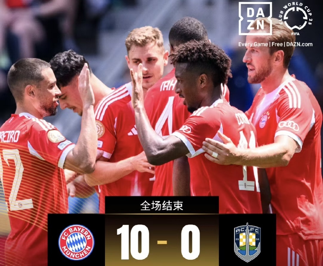 C组第1轮,拜仁以10比0大胜奥克兰城,创下世俱杯的单场进球数纪录,之前的纪录是8球。这是一场职业队与业余球队的“练习赛”,拜仁射门次数以31比1领先、射正次数以17比1领先,穆西亚拉上演“帽子戏法”,35岁的穆勒梅开二度,完成了拜仁生涯250球。2025世俱杯的第一个进球也诞生在本场比赛中!科曼开场仅6分钟就头球破门!取得拜仁在本届世俱杯的首球。