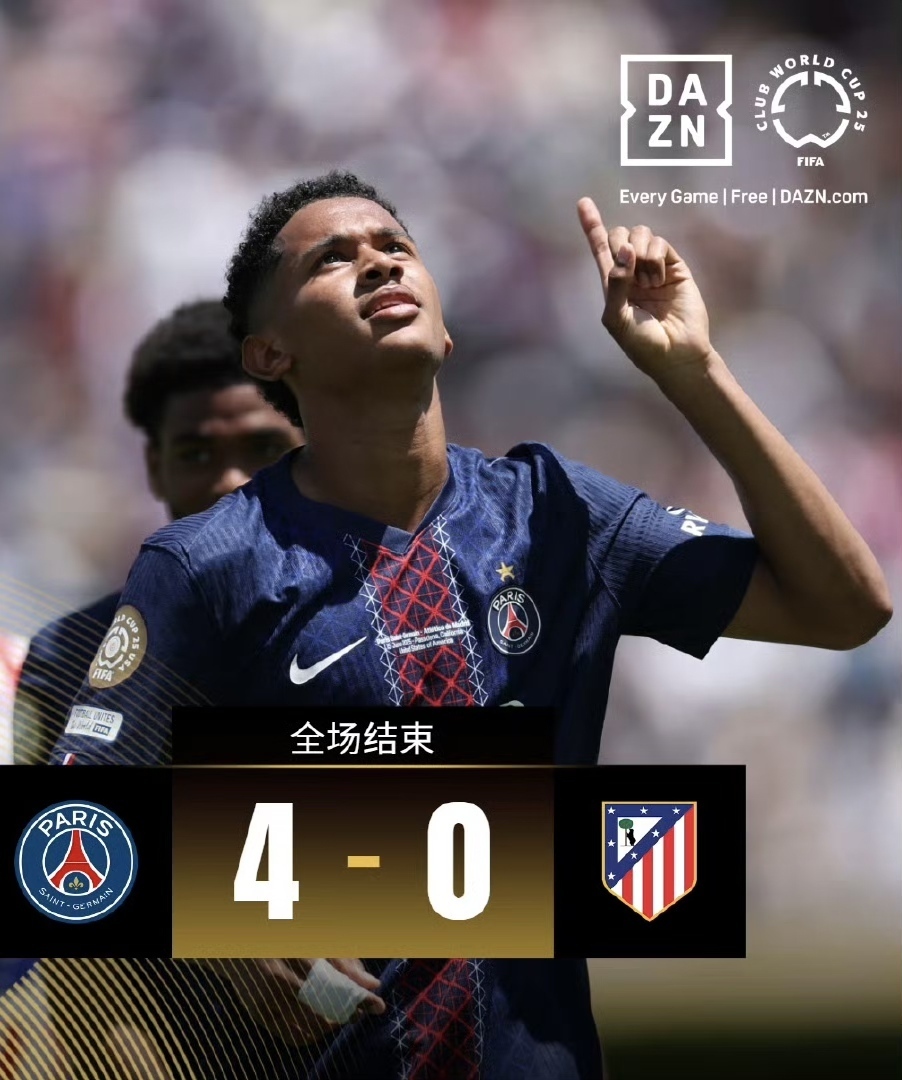 上半场,克瓦拉茨赫利亚先后助攻法比安·鲁伊斯、维蒂尼亚破门,后者也成为本场比赛的最佳球员,马竞的朗格莱在下半场吃到本届世俱杯的第一张红牌,大巴黎再下两城,最终以4球完胜。全场的技术统计数据一边倒,大巴黎的控球率高达74%、传球成功率为95%,射门次数16比5领先,射正次数更是以11比1领先。