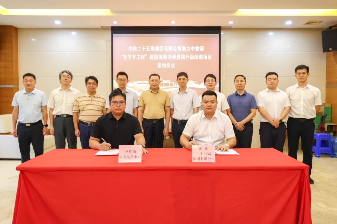 近日,东莞市中堂镇与中铁二十五局集团有限公司举行助力“百千万工程”槎滘堤围沿岸道路升级改造项目签约仪式,签署项目帮扶协议书,推动建筑业央企深度参与中堂镇“百千万工程”建设。中堂镇党委书记陈荣武,中铁二十五局集团深莞惠指挥部总经理古国贞,镇领导王振秋、何煜熙等参加签约仪式。