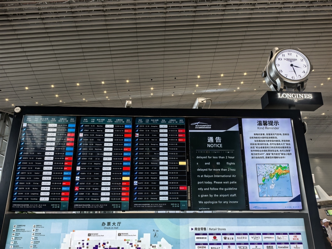 白云机场提醒广大旅客,雷雨天气出行,请密切留意航班动态,提前做好出行规划。
