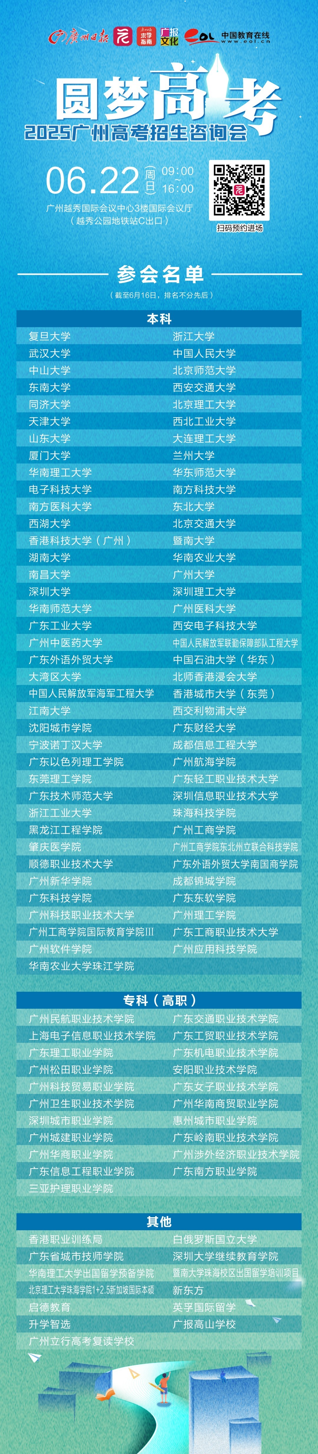 2025年广东高考结束已有一周,按照官方安排,预计考生再过12天就要填报高考志愿了。为回应社会需求,由广州日报报业集团(广州日报社)主办,广州日报社健康教育新闻部、广州广报文化发展有限公司、中国教育在线联合承办的2025年广州高考招生咨询会将于6月22日9时—16时在广州越秀国际会议中心举行。超100所省内外好大学准时集结,公益助力科学填报高考志愿。