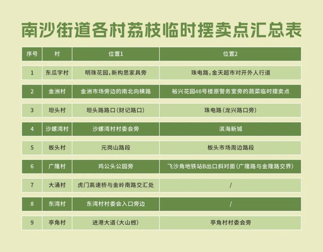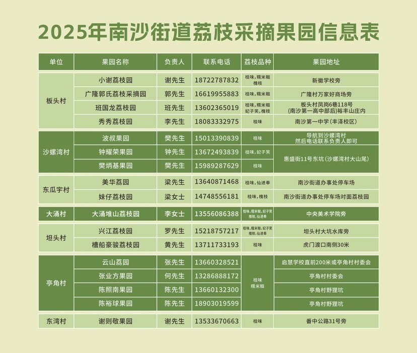 据悉,南沙街道超5000亩荔枝种植面积,约2000吨优质荔枝陆续上市,各村村支书推荐17个果园,好吃又好玩。