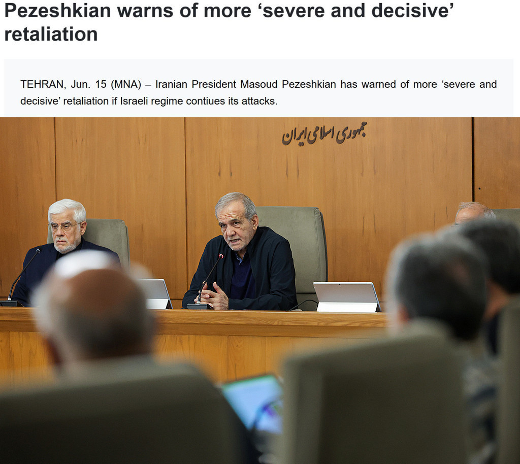 伊朗总统佩泽希齐扬6月15日在内阁会议上表示,如果以色列的敌对行动继续下去,伊朗将采取“更果断、更严厉”的回应。