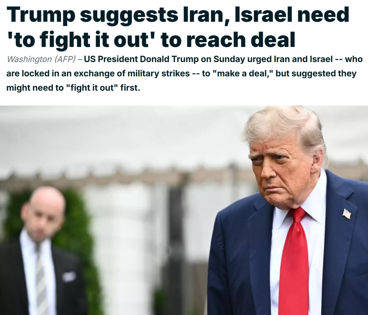 同一天,美国总统特朗普在启程前往加拿大参加七国集团峰会前表示,他认为以色列与伊朗“有很大可能”达成协议,但也称“有时候他们需要打一仗”。