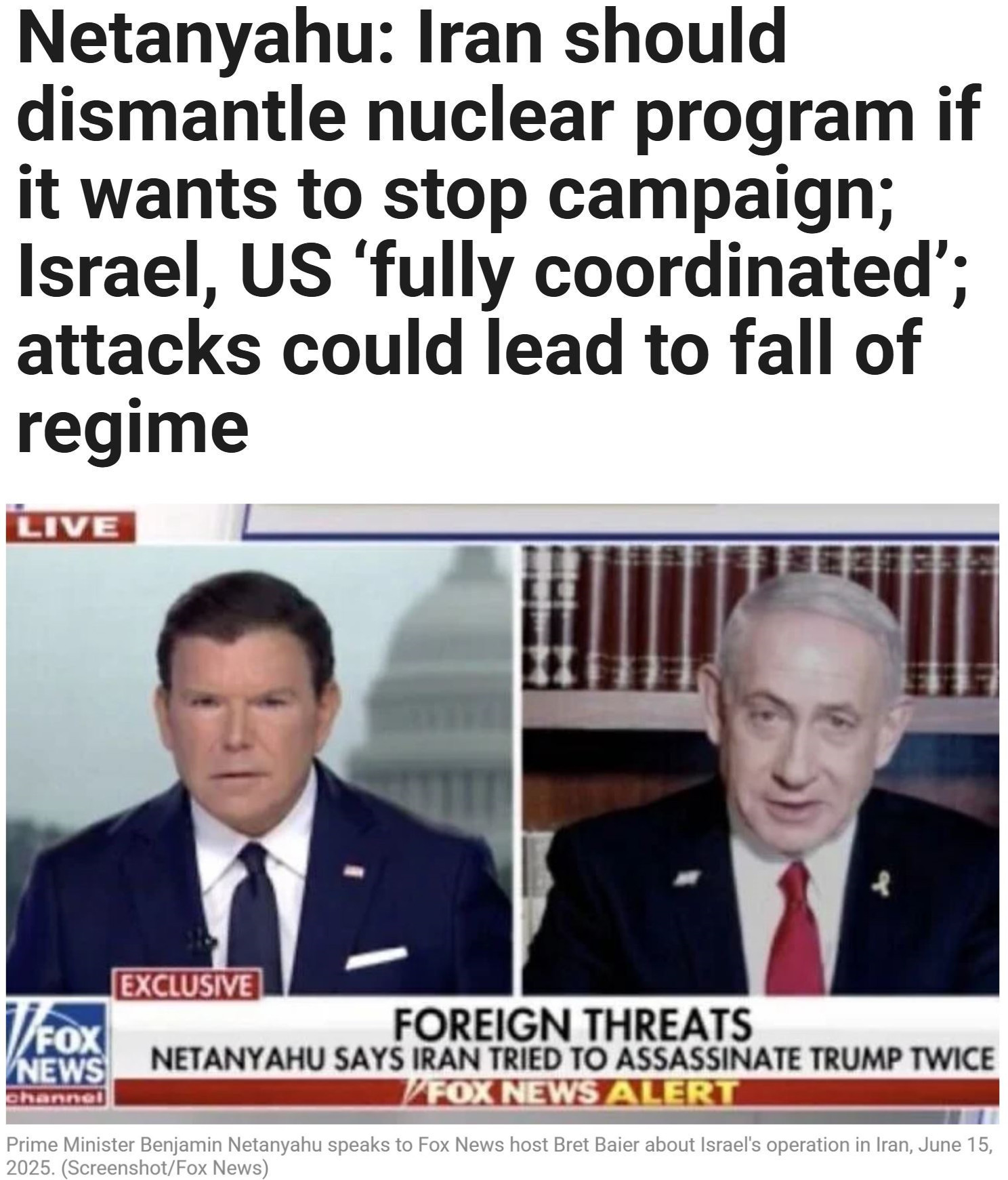 以色列总理内塔尼亚胡6月15日在每日视频讲话中表示,以方将彻底消除伊朗核计划和弹道导弹能力的“双重威胁”。他表示,过去四十年来,他一直认为“对以色列生存的最大威胁是伊朗获得核武器”。