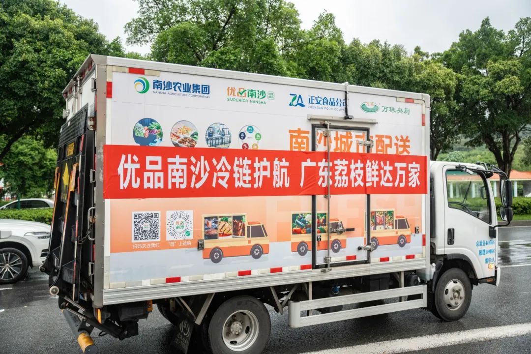 在发车授旗现场,黄阁镇与南沙现代农业集团合作打造的“南沙优品冷冻荔枝专车”整齐列阵,十分醒目。