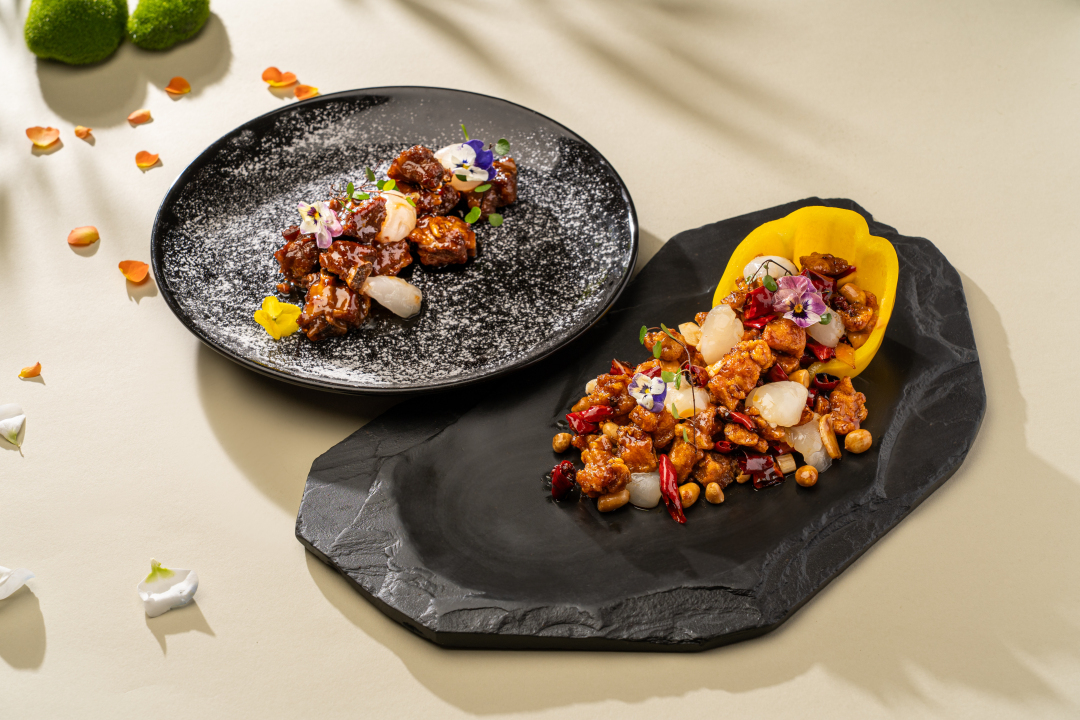 瑞士酒店的辣子鸡荔枝和白天鹅宾馆的荔枝宫保鸡丁的做法更是让人意想不到。辣子鸡荔枝是冰火碰撞的味觉狂欢,鸡件炸至金黄酥脆,加入干辣椒、豆瓣酱、花椒热油爆炒,顷刻间浓香绽放,点燃食欲。徐师傅提醒道,冰镇过的荔枝肉是点睛之笔,让看似“水火不容”的搭配,在舌尖达成完美和解。尝一口辣子鸡,川味的麻辣霸道席卷味蕾,辣意还未散尽,品一啖荔枝,清甜的汁水在口腔爆开,中和燥热,只留下满嘴的复合香气。