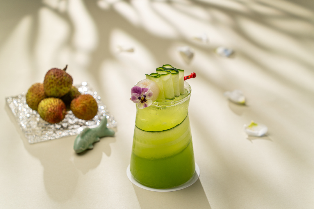 气泡与果香的结合,便有了白天鹅宾馆的“轻红香荔”,它恰似琉璃清梦。青瓜幽香丝丝渗入荔肉,接骨木花与苏打水在杯中绽开雪浪千叠。浅啜间,荔枝的蜜意裹着青瓜清气扶摇直上,万千气泡簌簌轻语,恍见岭南烟雨化作杯中凉雾。