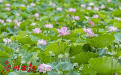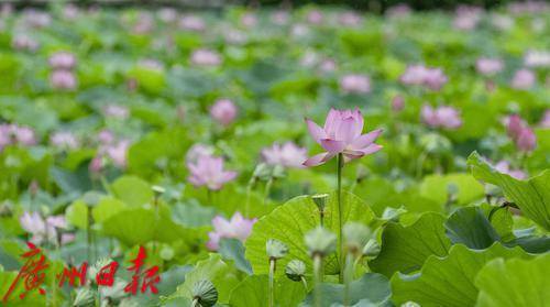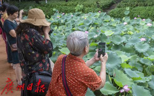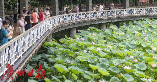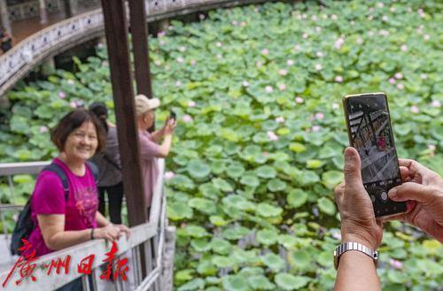 6月17日上午,细雨淅沥,荔湾湖公园海山仙馆的长廊上聚集了不少观赏荷花的市民和游客。这里的荷花种植面积达2.3万平方米,目之所及皆是荷花,成为广州夏日赏荷的最佳去处之一。