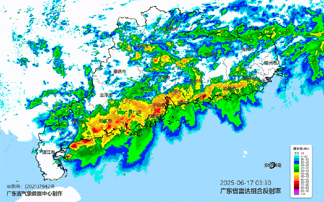 6月17日早上,据广东天气消息:雷雨云团兵分两路,一路横压在广东省沿海一带,一路在清远、韶关和河源等地。雷雨云团所到之处雨势强烈,风大雨急,多地已发布暴雨红色预警信号,请注意做好强降水及其引发的次生灾害。