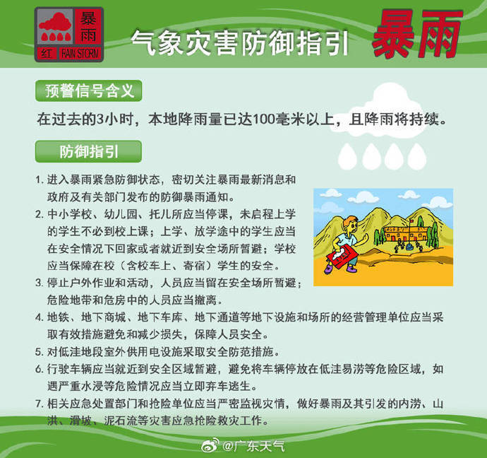 根据《广东省气象灾害防御条例》,当气象部门发布暴雨红色预警信号,可视为停课信号,其生效期间,托儿所、幼儿园、中小学校、中等职业学校应当停课。当暴雨橙色预警生效,学生可以延迟上学,上学、放学途中的学生应当就近到安全场所暂避。