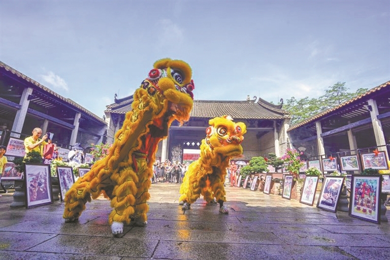 古祠堂里狮舞腾跃,展现番禺岭南古邑文化魅力。图/广州日报新花城记者:肖桂来 通讯员:赵少城