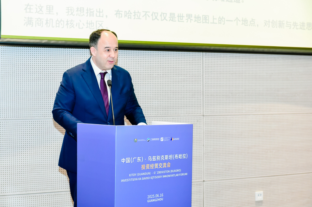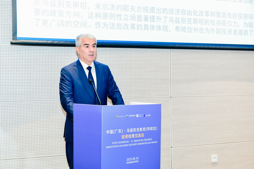 “作为布哈拉州州长,我诚挚邀请中国企业家来我州开展商业活动,并保证为所有企业提供全面的法律和政策支持。”交流会上,乌兹别克斯坦布哈拉州州长Botir Zaripov回顾了两国源远流长的友好关系,并指出此次交流会必将有力拓展双方在贸易、经济和投资等领域的深度交流。他重点推介了布哈拉州的投资优势与发展潜能,热切期待与广东企业在工业、现代农业、医药、旅游等领域建立深度合作,并向广东企业发出诚挚的赴乌投资兴业邀请。