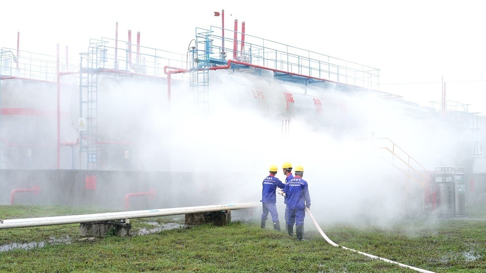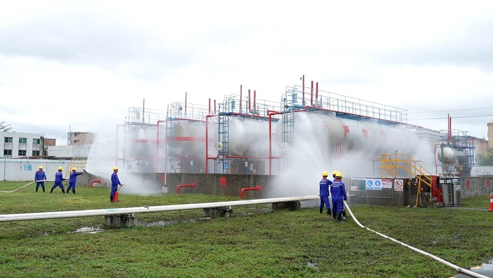 演练模拟强对流自然灾害下,储罐区液相管阀法兰密封垫损坏导致液化气大量泄漏而采取的一系列应急处置措施。在演练指挥部的指挥下,各小组配合有力,警戒疏散、喷淋、医疗救护、通讯联络、抢险等应急小组分工明确,相互协作,迅速处置储罐根部阀泄漏险情,转移抢救受伤人员,避免了更大的次生事故发生。