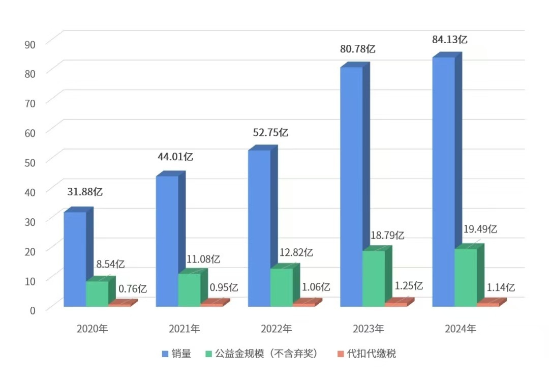2024年度广州共销售体育彩票84.13亿元,同比增长4.15%,其中销售竞猜型彩票53.35亿元,占彩票销售总量的63.41%,乐透数字型彩票和即开型彩票的占比分别为14.54%和22.05%,筹集各级体彩公益金总额为19.49亿元。