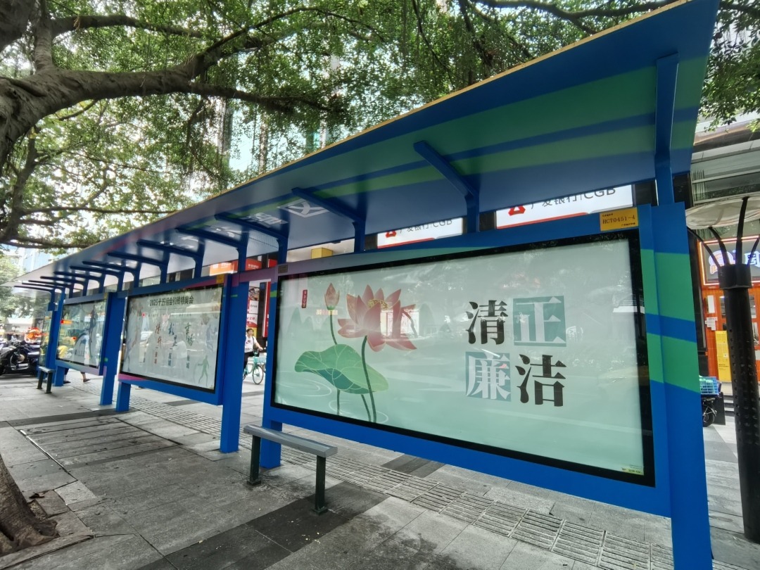 顶棚以动感流畅的线条展现“激情全运会 活力大湾区”的宣传口号,激发市民自豪感;亭身整体以明快的色调呼应运动主题,并融入网球、篮球等全民体育项目剪影,体现全运会体育精神与广州城市新活力;整体主色调以天蓝为主,呼应全运会视觉形象,营造出活力、动感的氛围,并巧妙融入廉洁文化符号,通过视觉语言传递“廉洁办赛”理念。