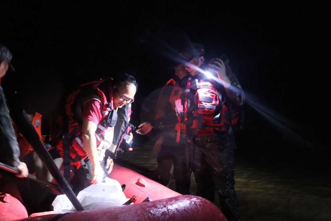 由于受灾地区内涝严重,道路被塌方的树干、石块阻断,大型作业车辆和救援设备无法到达救援现场。任务官兵立即改用乘坐小艇或以徒步涉水的方式进入受灾一线,采取分区划片、点面结合、拉网搜索的方式展开搜救行动。