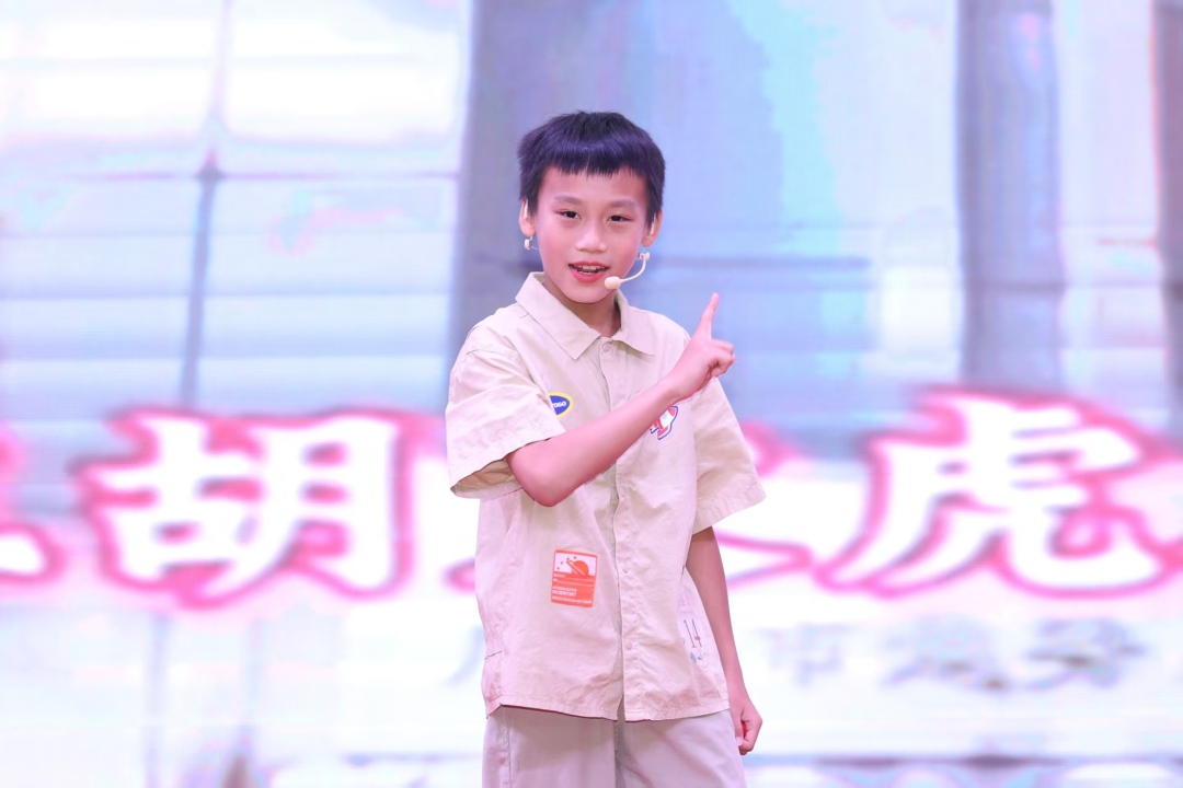 “头晕晕眼花花,闻一闻醒脑提神,嗦一嗦舒筋活络。醒神晒啦!万金油真係老广嘅挚爱。”本次大赛金奖获得者之一、来自广州市越秀区红火炬小学的杨璞同学巧妙运用粤语“讲古”这一本土非遗艺术形式,绘声绘色地演绎了爱国华侨胡文虎兄弟筚路蓝缕创办企业、爱国奉献的感人事迹,赢得阵阵掌声。