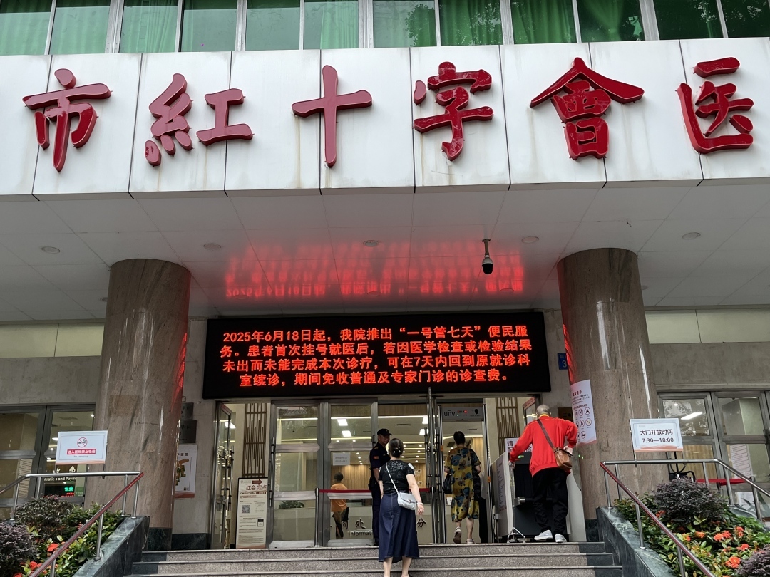 广州市红十字会医院在门口显眼处宣传该院“一号管七天”便民服务。