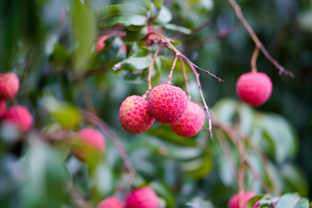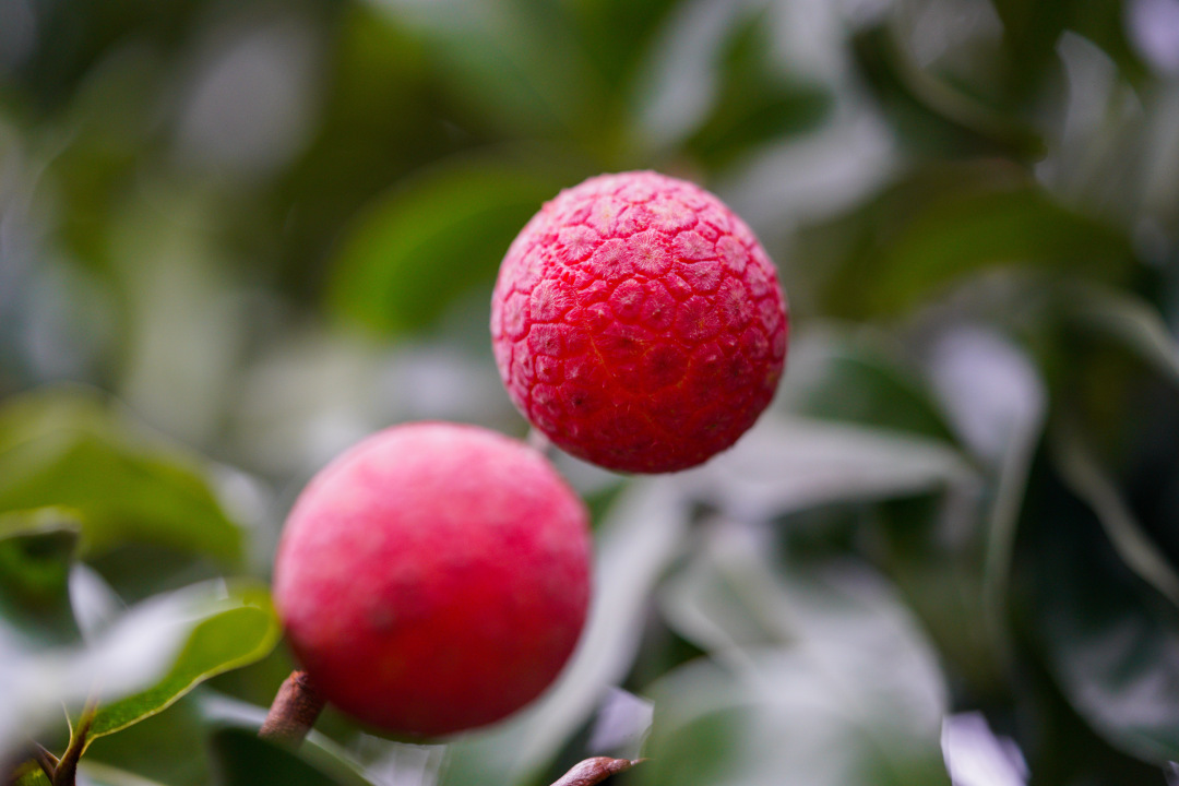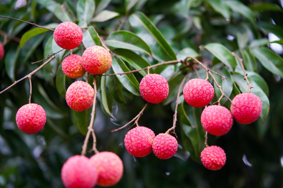 在海珠湿地二期,只见一簇簇红艳饱满的荔枝压弯了枝头,在绿叶掩映下格外醒目。熟透的桂味荔枝果壳泛着深红,表皮密布着细小的凸起,轻轻一碰,便能嗅到清甜的果香;而槐枝荔枝则稍显圆润,红中透着一抹金黄,沉甸甸地缀在枝丫间。