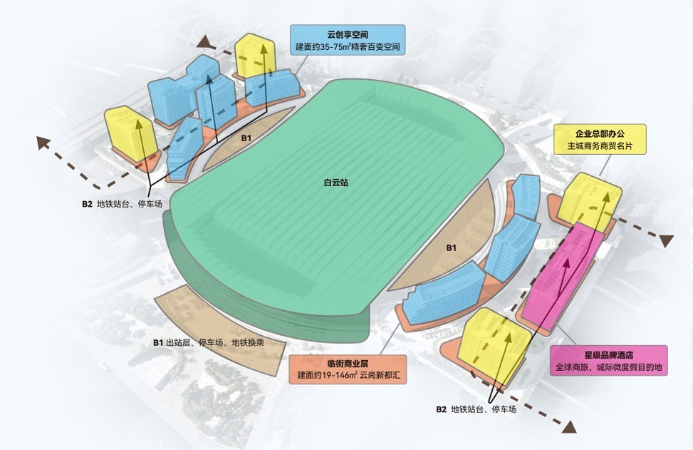 建筑的内部景观设计以“云”为主旋律,将形成全龄、全能的空间体验,会客社交空间、娱乐互动空间、弹性街区空间等为都市生活营造静谧一隅。而四大复合业态——云尚新都汇、云创享空间、企业总部办公、星级品牌酒店将形成叠加效应,通过满足不同人群交通、商业、办公等需要,形成一个完整的“生态圈”,以超级综合体之势助力白云站商圈的发展。