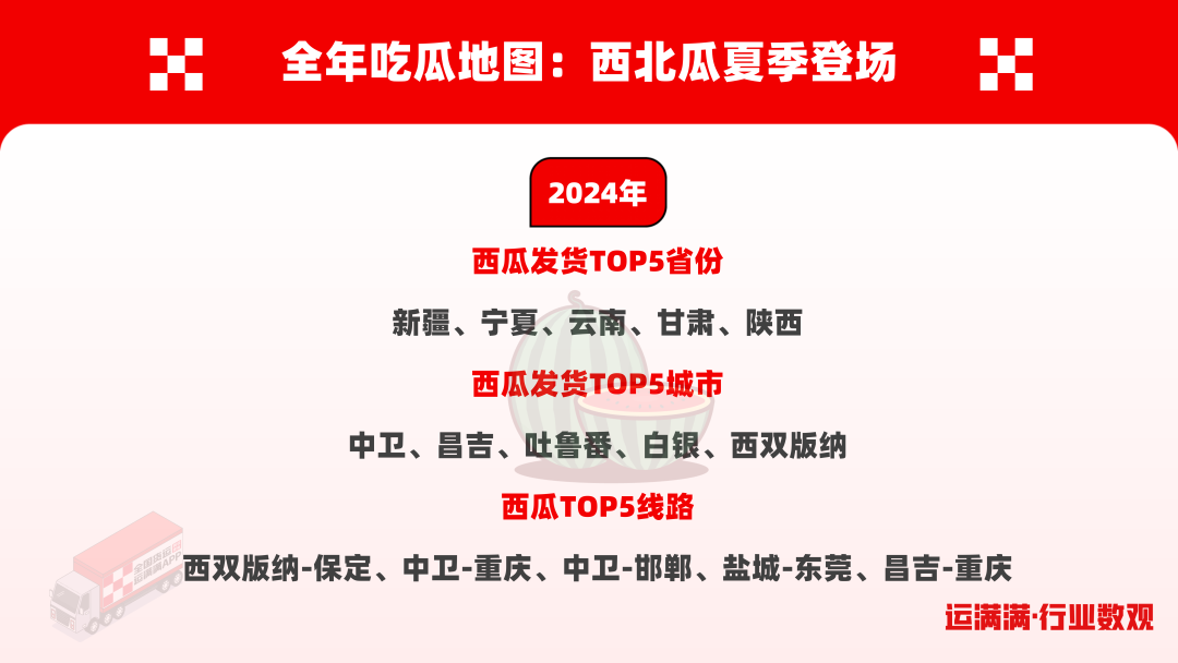 夏天一到,吃瓜是正事儿!但你知道手里那块甜到心坎的西瓜来自哪里吗,可能来自3000公里外的云南或新疆!运满满最新发布的《西瓜行业数观》揭开了2025年“吃瓜江湖”的秘密:云南瓜上半年逆袭成“顶流”,上海人一边自产8424一边狂炫外地瓜,而东北老铁靠山东瓜“闯关东”送来一份甜蜜,东莞是名副其实的“吃瓜大户”,从各地收“名瓜”……看看这份行业数据观察里能定位到自己的家乡吗?