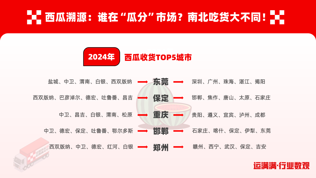 保定作为大型果蔬集散地,西瓜则分散来自西双版纳、巴彦淖尔、吐鲁番等全国西瓜主要产区;重庆的西瓜多来自中卫、昌吉等西北地带;邯郸从中卫、德宏等产地运瓜,同时又从仅300公里外的保定进瓜;郑州同样作为大型果蔬集散地,西瓜也多从云南、宁夏等地运来。