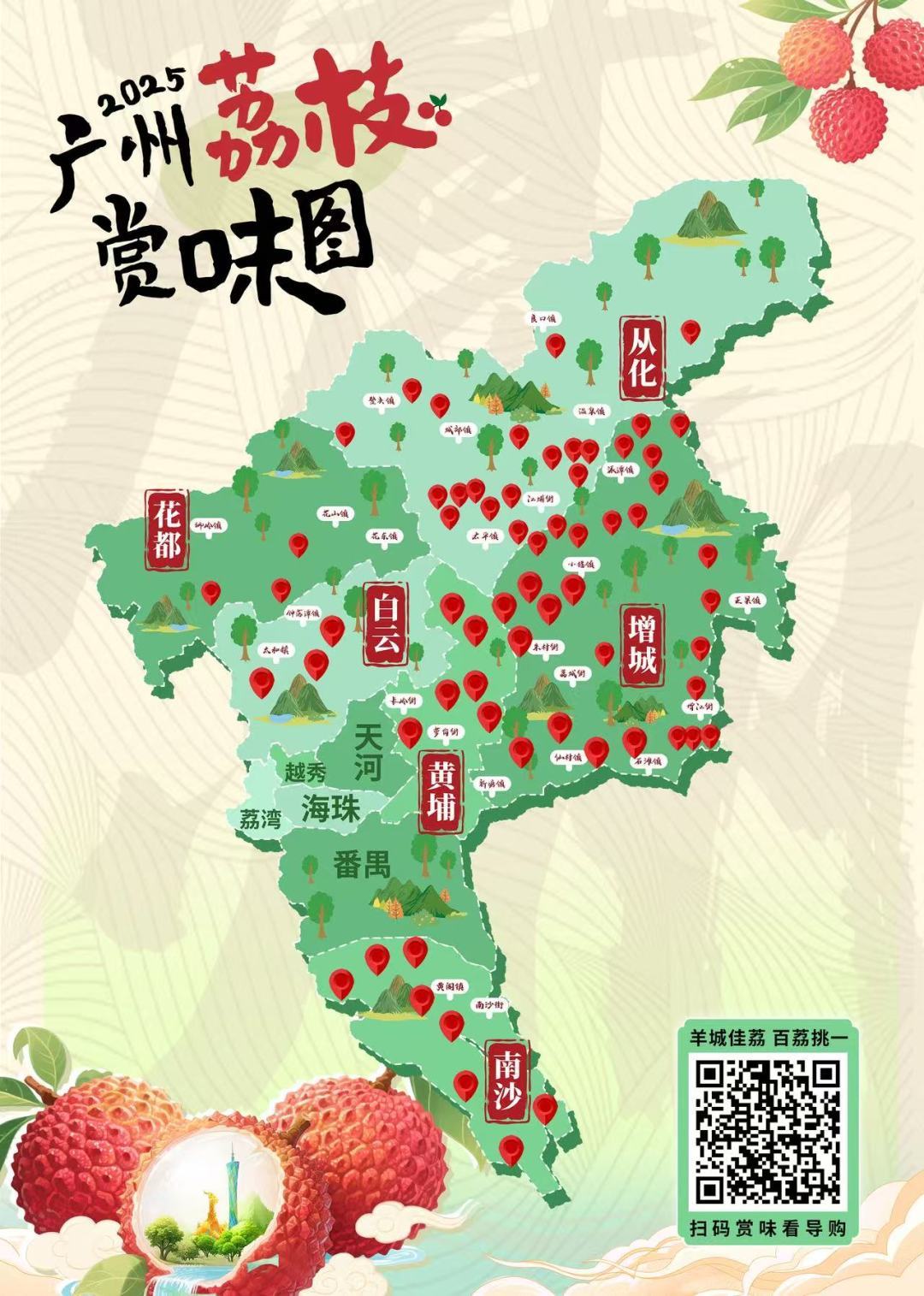 如何吃上广州好荔枝?你只需要一张“赏味图”。今年,市农业农村局全新打造广州荔枝赏味图,公众按图索“荔”,能够轻松找到仙进奉、糯米糍、桂味、井岗红糯等优质荔枝。设计风格清新、活泼生动、功能齐全,力求为大家带来全新体验。