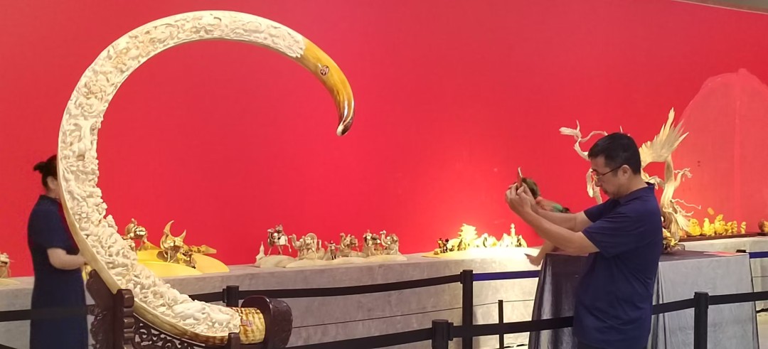 湖南剪纸作品《安化茶香飘万里》,长41米,宽1.2米,由国家级非物质文化遗产代表性项目梅山剪纸传承人用十年时间完成反映安化茶文化历史的长卷设计稿,10人2个多月时间,运用锉花技艺制作完成;上海刺绣作品《锦绣中华 非遗梦天》,一组24件,采用苏绣、顾绣、蜀绣、湘绣、苗绣、青海刺绣、湖北大冶刺绣等,运用百余种刺绣针法融合创新;辽宁玉雕作品《水生世界》,一组6件,总计长3米,巧妙运用岫玉的天然纹理与色泽,通过精细的雕刻手法,将水母的形态与动态完美呈现;浙江木雕作品《梦回大唐》,总长4.5米,以盛唐文化为背景,精选老竹根为材,采用圆雕、透雕、镂雕等多种雕刻技法,分别从文人雅趣、宫廷生活、体育运动三个方面,生动再现了唐代的盛世风貌和人文精神;新疆兵团非遗面塑作品《鹰舞天山》,总长2米,以柯尔克孜族猎鹰文化为核心,通过骑马人物与猎鹰的动态组合,展现游牧民族与自然共生的精神图腾;山西堆花作品《盛世吉祥图——中国珍禽褐马鸡》,全长5米,以丝绸堆叠八百里太行山水、花鸟,体现四季变化。