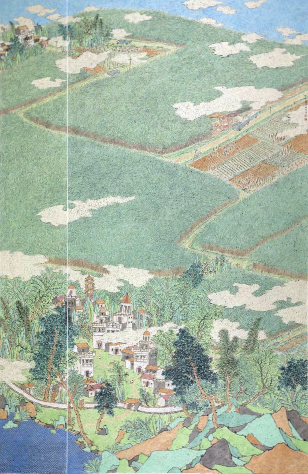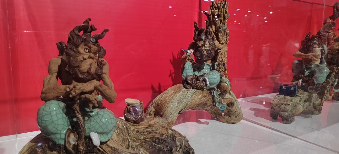 广东作为东道主,推选5件彰显岭南文化特色的力作亮相,包括广州玉雕《四灵纪》,在玉髓方寸间构建东方宇宙模型,将“四象神兽”与数字技术结合,体现了民艺表现手法的新探索;江门农民画作品《红土地上甘蔗甜》,突破年画媒介,在半生熟皮纸上重现建设史诗;深圳陶刻《陶镌华章》,将历代经典诗文镌刻于陶坯,实现文字载体与工艺美学的融合;深圳花丝镶嵌《国色(花丝手包)》,以非遗技艺重构时尚单品,使传统花丝工艺融入当代生活语境;佛山石湾陶塑《神仙放假的一天》,以“九宫格”样式展示一位“神仙”轻松写意的一天,风格诙谐,展现非遗传承的年轻化表达。