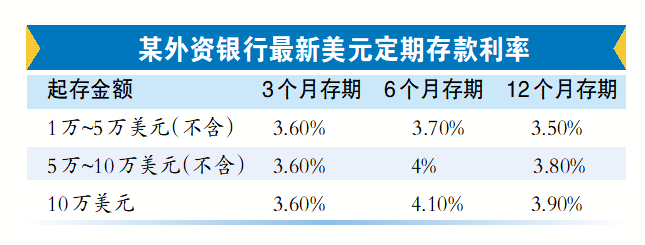记者调查多家外资银行美元存款利率发现,3个月期的美元存款年利率一般在3.5%~3.6%。根据起存金额的不同,6个月期美元存款年利率在3.7%~4.1%区间,1年期美元存款年利率在3.5%~3.9%。