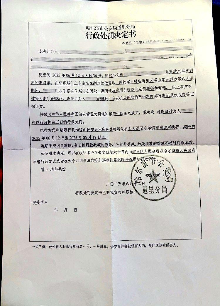 警方调取车内监控的后台数据后,定性司机猥亵的事实,当日对涉事司机处以行政拘留。赵女士出示的哈尔滨市公安局道里区分局《行政处罚决定书》显示,6月12日8时36分,网约车司机宋某某驾汽车接到网约车订单,乘客赵某上车乘坐在副驾驶位置……宋某某用右手搭在了赵某左腿处,期间还故意用手碰赵某左侧腿部和臀部。根据有关规定,决定对违法行为人宋某某处以行政拘留五日的行政处罚。