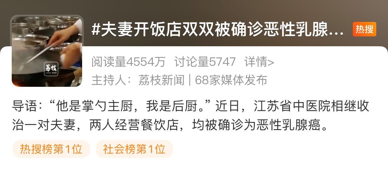 近日,“夫妻开饭店双双被确诊恶性乳腺癌”冲上热搜,引发网友热议。