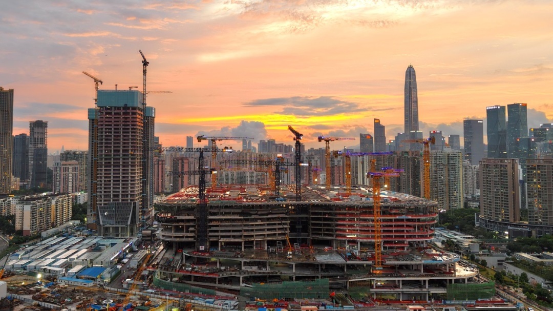 晚霞映照下的新皇岗口岸联检大楼主体施工现场。皇岗口岸是我国第一个,也是深港唯一实行24小时旅检通关的大型陆路口岸。随着深港两地交流不断深化,皇岗口岸原有功能无法满足未来需求, 2019年开启重建工程。新皇岗口岸通关模式以“合作查验、一次放行”,取代原有的“两地两检”,将带来“三个更加”红利,包括人员通关更加便捷,科创空间更加充足,人才生活更加舒适,为深港两地居民和海内外人才打造一个更适宜居住发展的良好环境。
