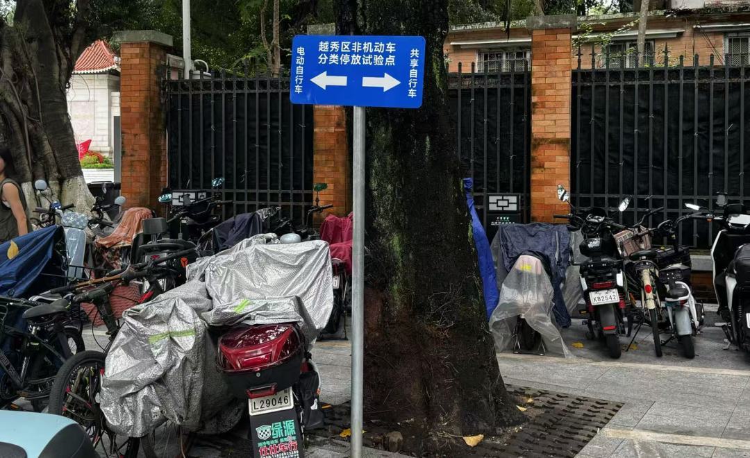 以烈士陵园地铁站D出口为例,地铁口空地设有越秀区非机动车分类停放试验点,并设置了醒目标志,电动自行车和共享自行车分别有序停放在两侧。其中,悬挂号牌的电动自行车占比挺高。地铁口周边还摆放了《温馨提示》告示板,“大声公”滚动播放规范电动自行车停放管理的指引,引导市民文明出行、规范停车。
