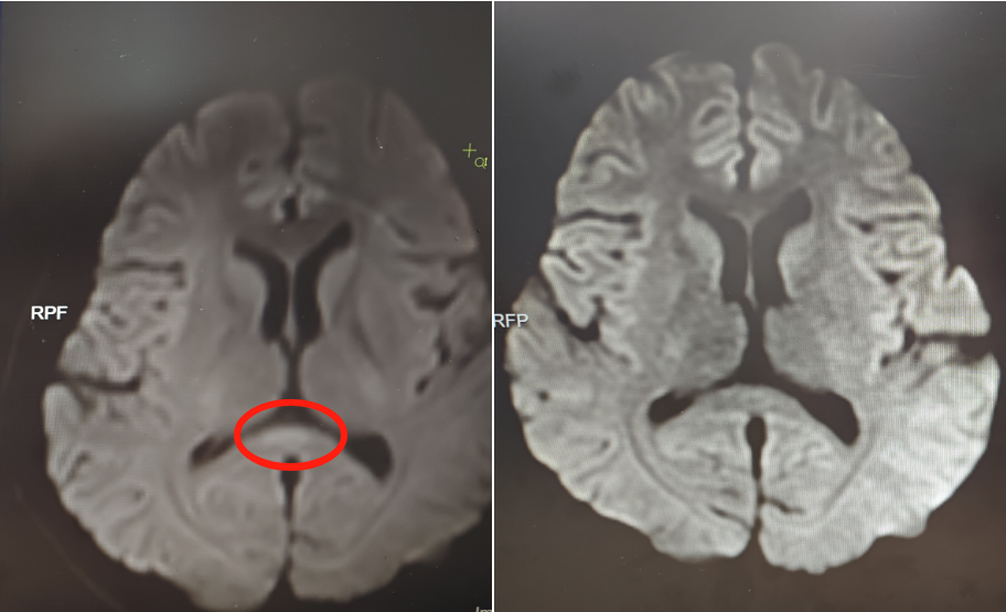 ▲治疗前(左)核磁共振提示胼胝体压部病变