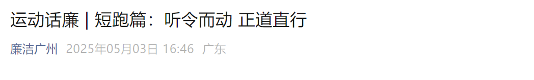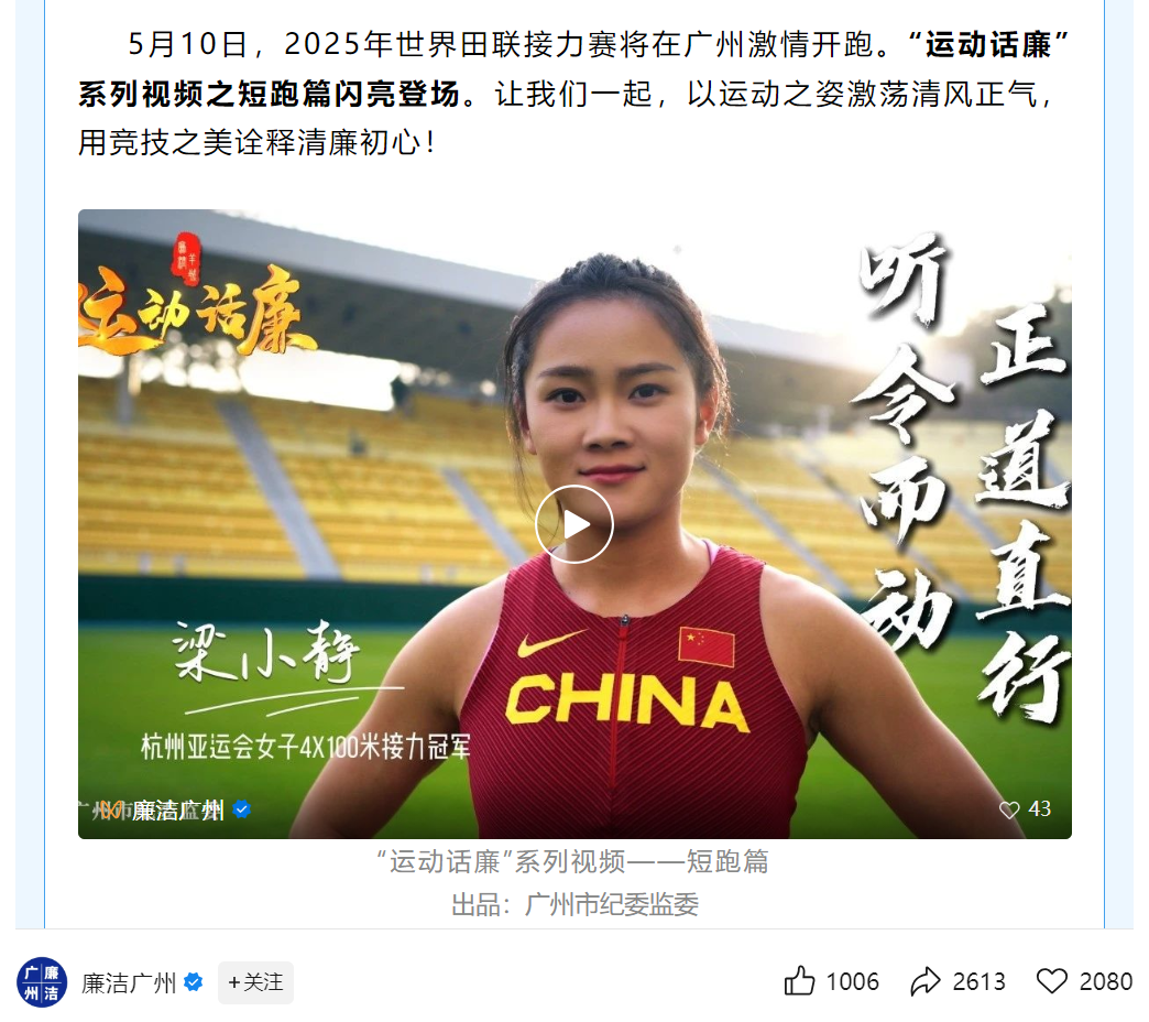 5月3日,“廉洁广州”微信号发布文章《运动话廉|短跑篇:听令而动 正道直行》,推出“运动话廉”系列短视频。一是创新形式,弘扬廉洁文化。该系列短视频借助即将在粤港澳大湾区举办的第十五届全运会,巧妙将体育精神与廉洁文化融合,推出“运动话廉”系列短视频,既助力宣传第十五届全运会,又创新宣传廉洁文化,实现双赢。二是借势体育赛事和运动员,取得良好传播效果。在2025年世界田联接力赛开跑之际,推出“运动话廉”系列短视频之短跑篇,由杭州亚运会女子4×100米接力冠军梁小静出镜,以竞技精神诠释清廉初心,取得良好传播效果。该文章阅读量达1.1万,累计获得2080个在看、1006次点赞、2613次转发。三是中央单位转发,进一步扩大覆盖范围。该文章获中央纪委国家监委网站、客户端首页推荐,有助于提升该系列短视频在全国范围的影响力。