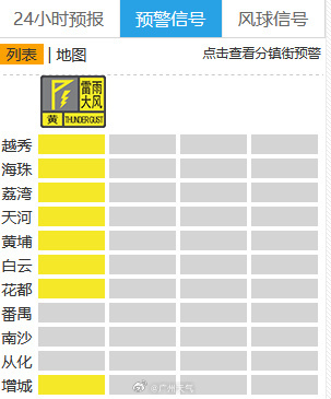6月20日17时,白云区、花都区、黄埔区、增城区、荔湾区、海珠区雷雨大风黄色预警信号也已经生效,请注意做好防御工作。