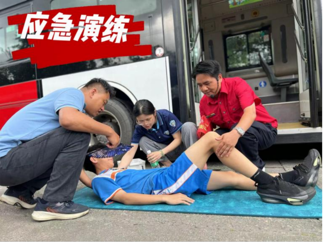 “学生晕倒可能由低血糖、中暑等引发,车长必须第一时间判断情况,避免二次伤害,并拨打120电话求助。”广州中医药大学第三附属医院医护人员现场指导。