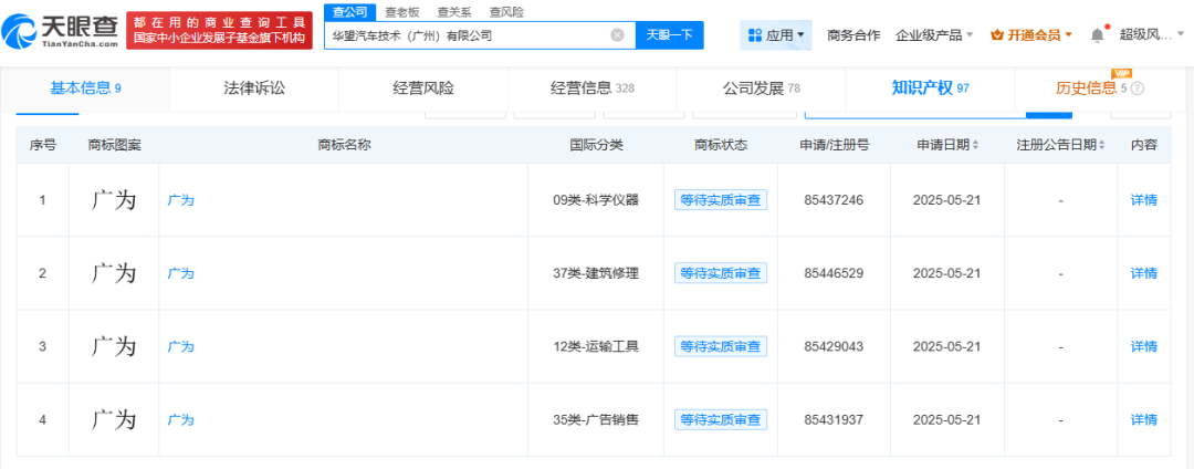 天眼查App显示,近日,华望汽车技术(广州)有限公司申请注册多枚“广为”“启境”“至境”“元方”等商标,国际分类涉及运输工具、科学仪器、广告销售等。