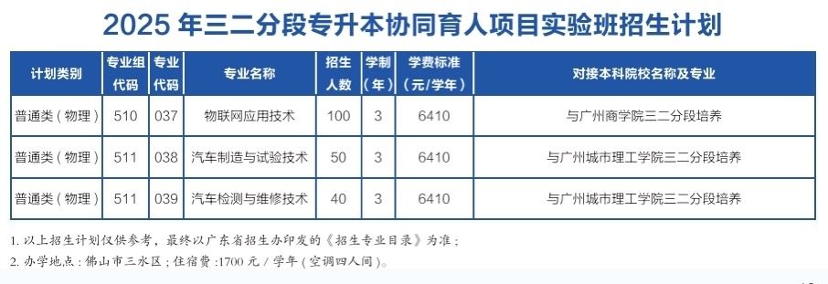 学校有物联网应用技术等3个专业与2所本科院校开展三二分段专升本协同育人项目,计划招生190人。