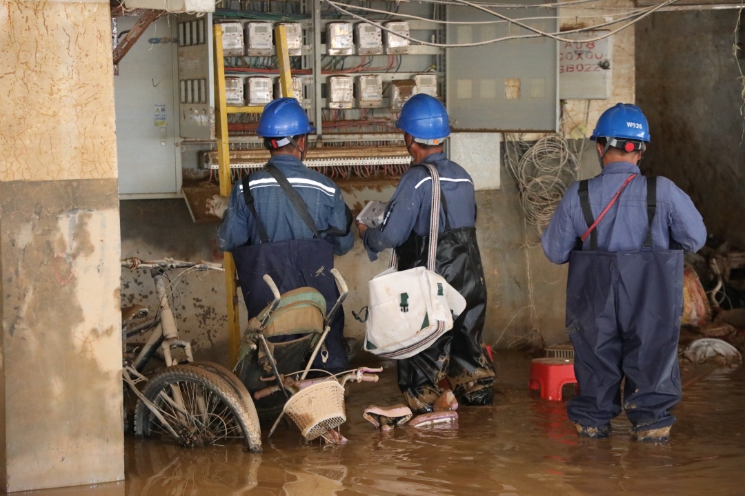 没有灯光,脚下的淤泥尚未退去,狭小的配电房,闷热潮湿的天气……让这场复电抢修战开展得异常艰辛。靠着安全帽上的头灯,一组又一组的抢修人员摸黑在拆装设备。