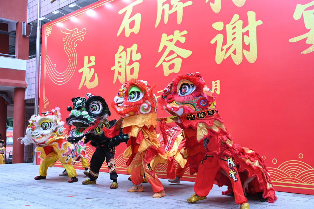 晚宴上,宾客们围坐在一起,说话声、谈笑声此起彼伏。当石牌小学会场石牌村醒狮队登场表演,场上迎来最热烈的时刻。伴随着震天的锣鼓声,狮头忽而压低作觅食状,忽而高高跃起,口中的狮舌灵活翻动,配合着鼓点节奏,喝彩的声音不绝于耳。