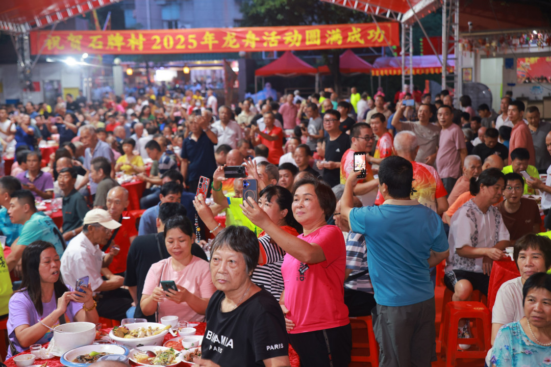 6月21日,广州天河石牌村内人潮攒动,一年一度的端午龙舟答谢宴正在举办,庆贺石牌村2025年龙舟活动成功。全天筵开近千围,参与人数近万人,场面盛大。