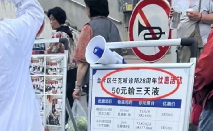近日,有网友在社交媒体发布视频称,位于成都市金牛区抚琴中街的某诊所,推出“50元输液3天”的促销活动,现场有穿着白大褂的人员在做推介。此举引发争议,有网友表示,“医疗不是买卖,打折治病听着就离谱,医疗商业化要有底线。”