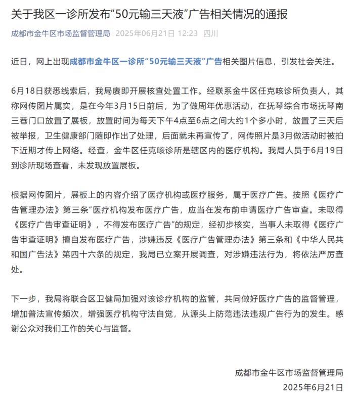 21日中午,四川成都市金牛区市场监督管理局通报:当事人擅自发布医疗广告,已立案调查。通报全文如下↓