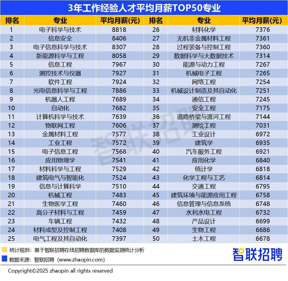专业薪资排名中,理工类专业优势仍然明显。在“3年工作经验人才平均月薪TOP50专业”里,“机器人工程”作为新上榜的专业,跻身前十席位,这与近年来人工智能机器人的开发与运用有密切关联。“电子科学与技术”专业持续占据榜首,该专业所学内容和机器人器件的研发也有所关联,未来或将热度不减。互联网行业近年来流量见顶,走势减弱,很多互联网公司存在招聘收缩的情况,行业的发展直接影响到从业者薪资,在榜单中可以看到,“软件工程”“计算机科学与技术”两大专业的排名连年下降,计算机科学与技术首次跌出前10。