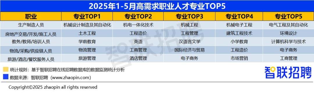 《攻略》显示,智联招聘2025年1—5月招聘需求占比TOP10职业中,除了上文提到的销售/商务拓展、客服/运营等职业,还包括生产制造人员、房地产交易/开发/施工人员、教务/教师/培训人员、物流/采购/供应链人员、旅游/酒店/餐饮服务人员。产业升级、政策调整、消费复苏等因素刺激了这些职位的招聘需求,这也再次提醒考生和家长关注宏观环境。