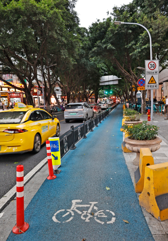 步行化改造的第一步,是把北京路步行街南拓260米到泰康路,这已在2022年实现。第二步再往南至天字码头,改造选择了交通影响最小的方案在近期实施,保留机动车道和非机动车道,重点依托新落成的同庆坊项目,在西侧拓宽人行空间。在这里,商业外摆延伸到骑楼下,客人惬意地喝咖啡看风景,树下的花草绿植带新增了座椅等城市家具,让步行者休憩歇脚,往外的非机动车道以彩色沥青区分,更添活泼动感。