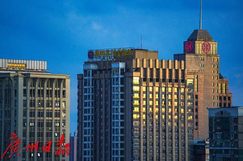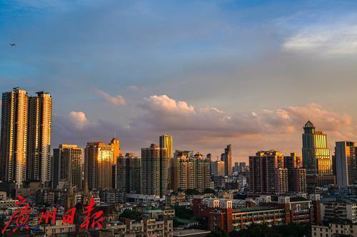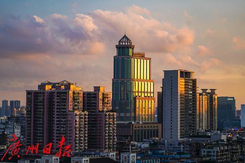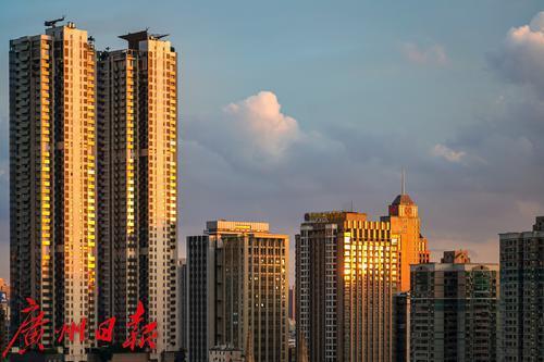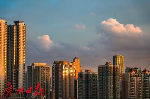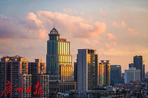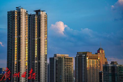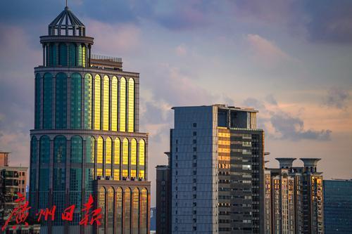 6月22日,夏至过后的广州有了夏日的感觉。“龙舟水”已停歇,澄澈的天空和层次丰富的白云让人看到了盛夏的模样。傍晚,夕阳落下,夕照斜射在城市天际线的建筑上,朝西建筑的窗户玻璃在夕阳余晖的映照下,满是灿烂的金橙色,与天空中橙粉、淡蓝交织的云彩,共同营造出城市夏日夕阳那温暖又富有层次感的氛围。